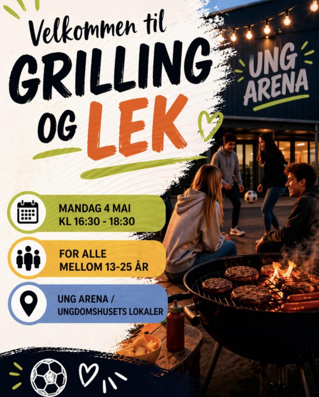 Ung Arena inviterer til grilling og lek den 4 mai kl 16:30-18:30 på ungdomshuset/Ung Arenas lokaler.
